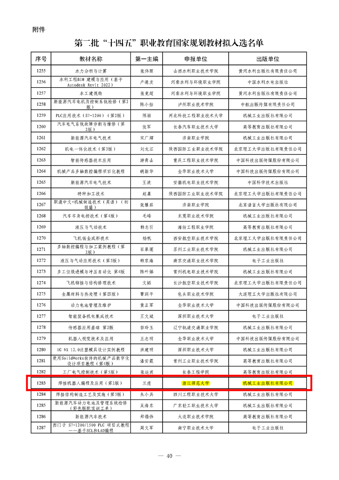近日,教育部公示了第二批“十四五”职业教育国家规划教材遴选结果,由副院长兰虎主编、机械工业出版社有限公司出版的《焊接机器人编程及应用(第2版)》教材成功入选。