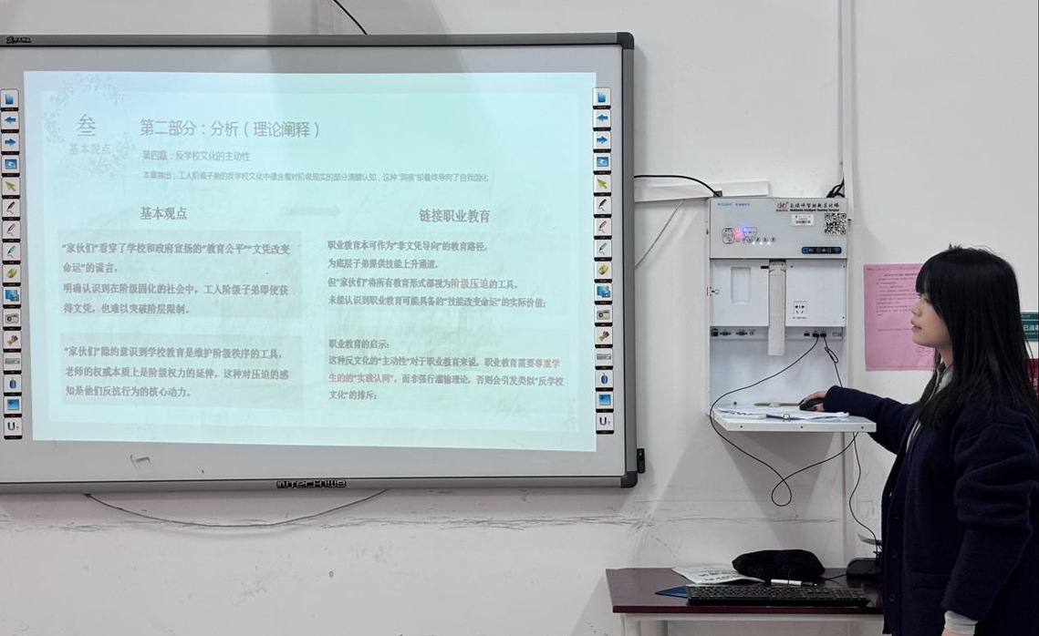 陈舒晴同学以“从‘反学校’到‘爱技能’:职业教育的认同重塑启示——《学做工:工人阶级子弟为何继承父业》”为主题展开学术分享,为职业教育改革与发展提供了社会学思考的视角。她从作者保罗・威利斯的学术背景介绍开始,梳理了该书的时代背景,在核心内容中系统拆解了《学做工》的双重维度,提炼出该书对职业教育发展的关键启示,提出职业教育应兼具“尊严的载体”“有用的教育”“流动的通道”三重属性,主张以“技能价值”替代“劳动形态”的固化认知,打破“体力劳动 = 工人阶级”的绑定;推行项目式教学与校企协同模式,以真实工作场景为核心实现“做中学、用中学”;构建完整升学通道,打破制度壁垒;建立以实践成果为核心的评价体系,让技能水平成为认可标准,彻底摒弃职业教育“差生专属”的偏见。
