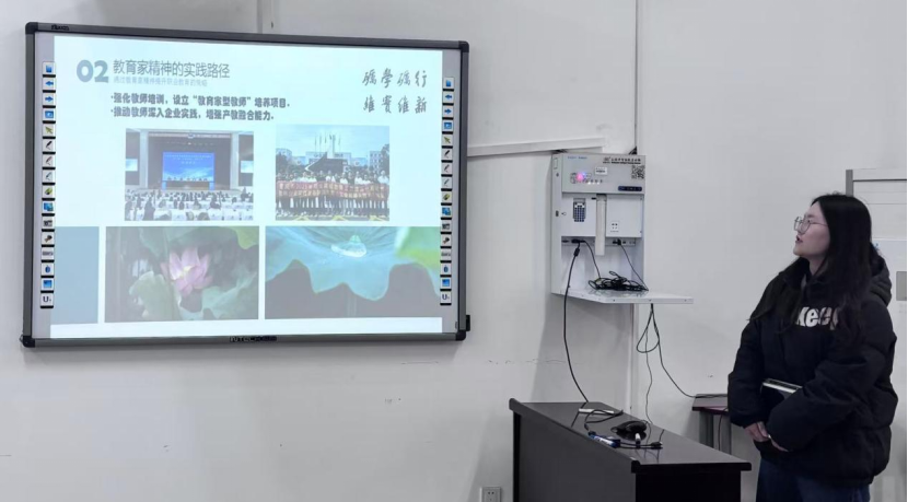 丰子童同学以“教育家精神与大国工匠如何协同赋能职业教育高质量发展”为主题进行分享。她通过两篇核心期刊文献引入,从微观精神引领与宏观系统优化双视角,点明职业教育作为中国式现代化支撑力量的重要地位,以及面临的质量提升与结构优化挑战,较为系统地论述了教育家精神与大国工匠赋能我国职业教育高质量发展的策略与路径。