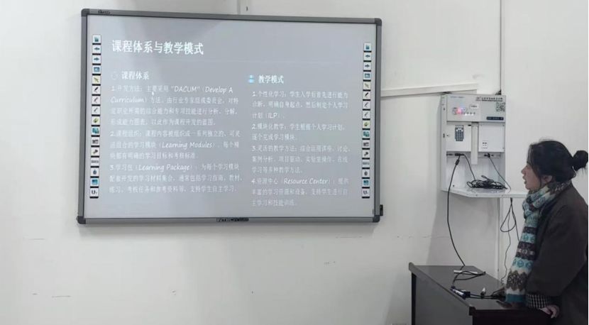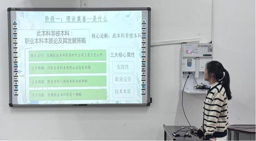 彭婉秋同学基于著作《现代五大职教模式》对德国“双元制”、英国“BTEC”、澳大利亚“TAFE”、北美“CBE”以及瑞士“三元制”等国际主流职业教育模式进行了对比分析和评价,为同学们普及了国外职业教育的基础知识,拓展了大家的国际视野。